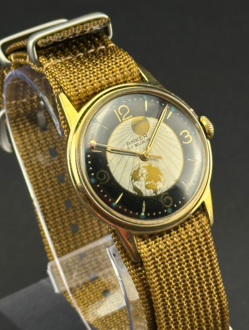 Anker, a German-Swiss watch brand established in the early 20th century, became known for its reliable mechanical timepieces that combined everyday practicality with timeless elegance. This particular model perfectly embodies the innovative energy of the 1960s — a decade defined by space exploration and a fascination with world travel. The distinctive “world map” dial and red-tipped seconds hand shaped like a satellite reflect the era’s sense of discovery and imagination.